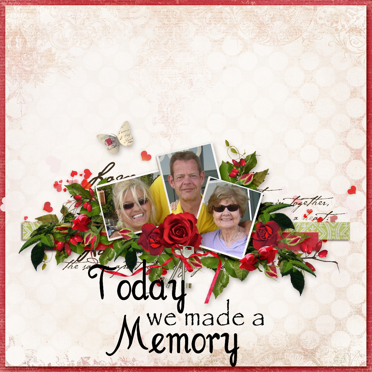 Here's Jannette, Mike and Annie in a QP by Raspberry Road Designs from the Heartstrings kit and the word art is by Linda at Random Thoughts. I am sure I will use others I took later, but for now, this is all I have had time to scrap.